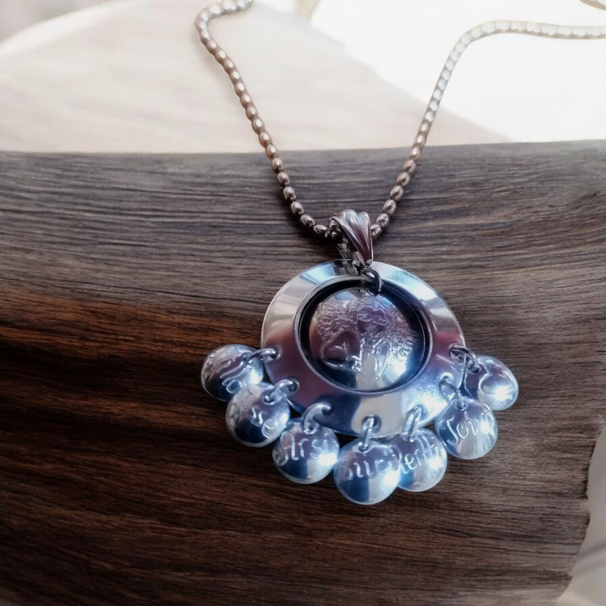 Koru on valmistettu käsityönä 925 hopeasta (saatavana myös kullattuna) ja sen halkaisija on 2,5 cm. Korussa roikkuvat nimilaatat on halkaisijaltaan 0,7 cm. Laattoja on korussa 7 kappaletta ja niihin voidaan kaivertaa vaikkapa lasten nimet. Max 7 kirjainta mahtuu yhteen laattaan. (8 jos tehdään pienemmällä koolla.) Jos haluat nimen tilalle sydämen kuvan laattaan, niin kirjoita ruutuun "sydän" ristin kuva, kirjoita ruutuun "risti. Myös enkelin taakse voidaan kaivertaa nimi. Max 10 kirjainta. Kaiverrukset sisältyvät riipuksen hintaan. Voit lisätä tarvittaessa 1 -2 kappaletta laattoja koruun. Hinta ilman ketjua. Kirjoita ruutuihin kaiverrukset, valitse sopiva ketju ja lisää ostoskoriin. Jos jätät ruudun tyhjäksi niin siihen kohtaan asennetaan sileä laatta. Tästä lahjaksi äidille kaunis koru, joka herättää kantajassaan tunteita. Tai miksi ei omaan kaulaan koristamaan kotimaista käsityötä. Toimitetaan kauniissa korukotelossa. Koru, joka kulkee matkassa koko elämänpolun. p.s. Jos et tarvitse seitsemää laattaa koruun, niin kirjoita nimen kaiverrus ruutuun "Jätetään pois"